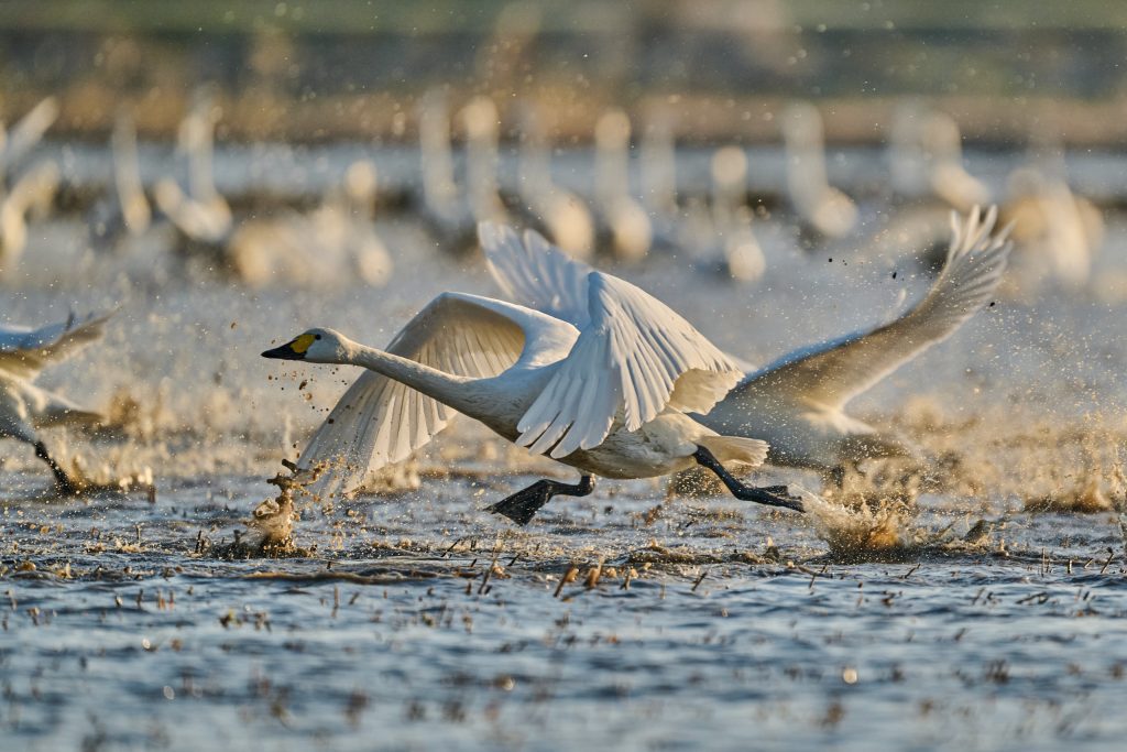 This is the classic “wild swan” of fairy tales. Identified by its elegant, straight neck and a powerful, lemon-yellow bill that extends in a wedge shape to its eye, the Whooper Swan is a winter migrant from the remote tundras and taigas of Northern Europe and Siberia. Their presence is often announced by their iconic, loud, and melodious trumpeting calls—a sound that truly defines the wild atmosphere of the region in winter. Seeing a large flock of these birds take flight, their powerful wingbeats audible from a distance, is an unforgettable experience.